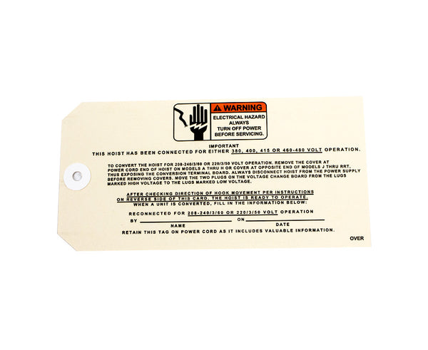 This tag contains operating instructions and is designed for Classic Lodestar Hoists, including small and large frame models.