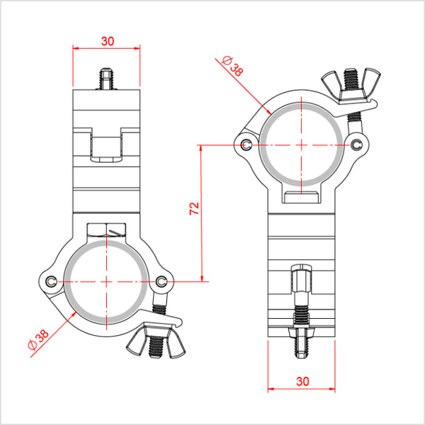Consists of a pair of high tensile extruded aluminium clamps back to back, and designed to swivel that are suitable for 38mm (1.5″) diameter tubes. It has a WLL of 100Kg and uses a pair of 30mm (1.18″) wide clamps. Ideal for decorative trussing as it will not damage the cords. Available in polished silver or powder coated black.