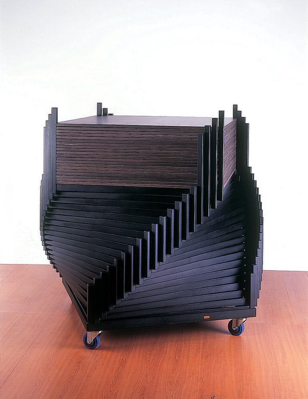The Storage Dolly comes with heavy-duty castors for ease of movement. It allows up to twenty-five module frames and deck panels to be kept conveniently together, while also furnishing a ready method of transportation in and around the venue. The frames and decks are placed in a spiral upon the Storage Dolly, thus the storage space needed is minimal.