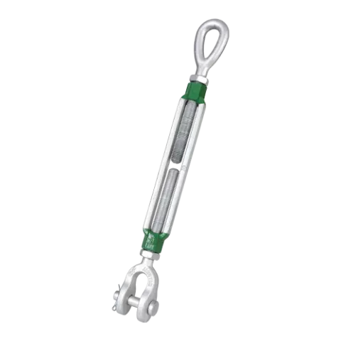 The Green Pin® EJ Turnbuckle is a turnbuckle with eye-jaw end-fittings, generally to ASTM F1145-92. The jaw is fitted with a safety bolt for sizes with a diameter thread up to 5/8" and fitted with a cotter pin for sizes with a diameter thread 3/4" and up. One of the unique features of Green Pin® Turnbuckles such as this one is that they can be used for both lifting and lashing. Galvanization of the Green Pin® EJ Turnbuckle ensures its long-term durability. The turnbuckle is available in a range with a diameter thread 3/8" (take up of 6") up to 2 3/4" (take up of 24").