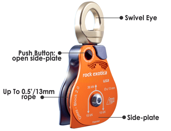 The Rock Exotica Omni-Block combines a swivel ring and a single-sheave pulley into one device and incorporates a uniquely-designed side-plate that opens while the pulley is still attached to the anchor.