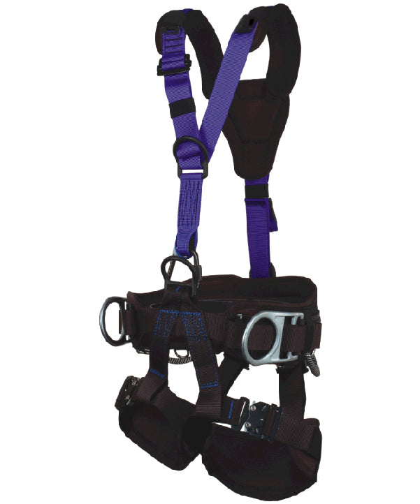 Easily adjustable for variations in clothing by use of camlock buckles. Attachment points at waist, hips, chest, back (lumbar) and back (dorsal). Extra-large, side positioning rings (lineman style) allow the user to easily make connections to the safety belt. Chest harness specifically designed to incorporate a chest ascender (not included) for tower access work and is specially tailored to reduce chafing of the neck. Weight 6 lb. 11 oz. Removable contoured shoulder pads included with standard 390 Harness.